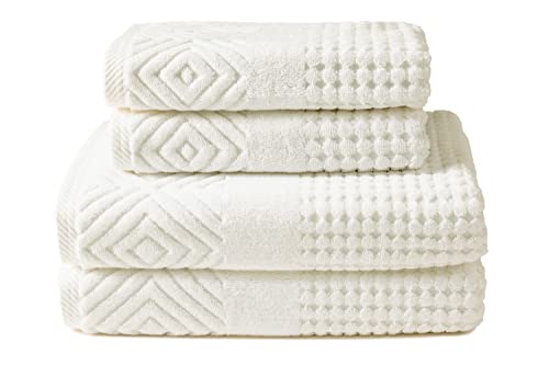 The cream-colored set arrives beautifully packaged, and the moment you touch these towels, the 700 GSM (grams per square meter) weight becomes immediately apparent. For context, most standard towels range between 300-500 GSM, so these are noticeably thicker and more substantial. The diamond jacquard pattern adds an elegant texture that catches the light beautifully, giving them that upscale hotel aesthetic we all crave in our bathrooms.